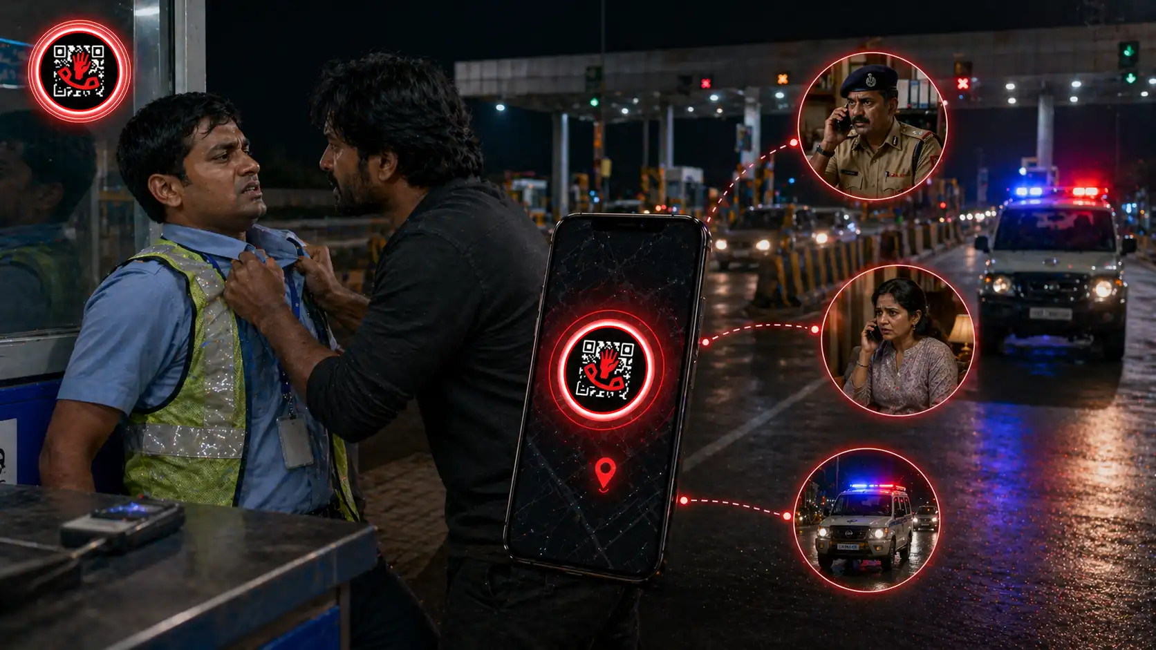 Tarun was working the 10 PM checkpoint at Sikandra Toll on the Agra-Lucknow Expressway when a driver became violent over a ticket and grabbed his uniform collar with both hands. His service phone was in the breast pocket — pinned by the assailant's hand. With the side of his thumb Tarun double-pressed the volume-down button through the cloth: HelpQR's panic-button SOS went simultaneously to the Sikandra thana duty officer and to his wife in Agra cantonment. A backup PCR van rolled out within 90 seconds and reached the toll in 6 minutes. The driver was detained; Tarun walked away with a torn shirt and an intact spine.