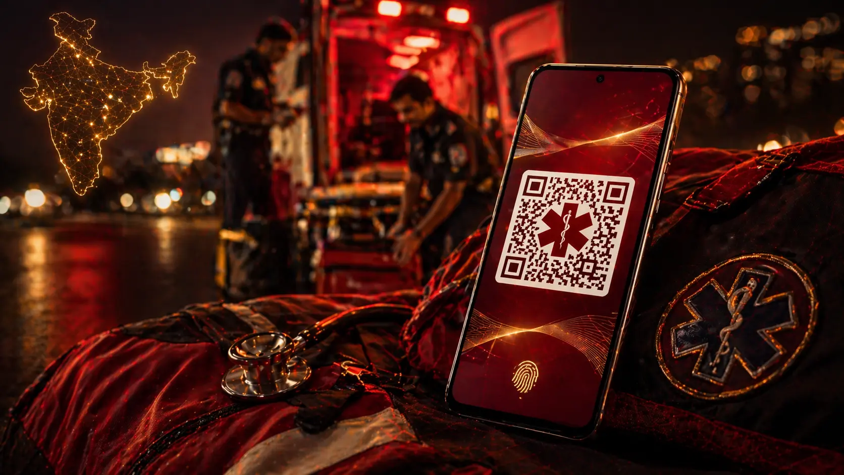 Indian ambulance crews — 108 services across Tamil Nadu, Andhra Pradesh, Karnataka — are now trained to check the victim's lock screen before calling emergency contacts. A visible QR is scannable in about five seconds and gives medical QR code phone wallpaper data that saves lives.